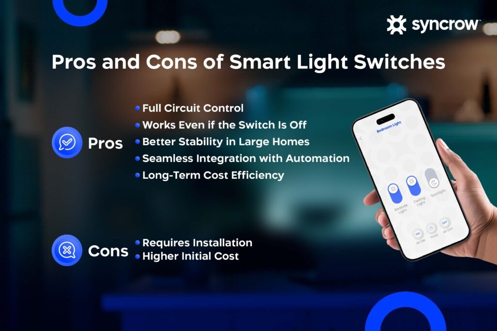 Unlike smart bulbs, with smart light switches, power is never cut off from the lighting system, ensuring consistent remote and automation control. This feature keeps the automation and scheduling working effectively even when the lights are turned off.